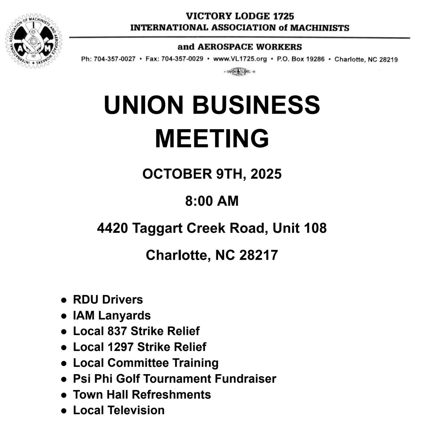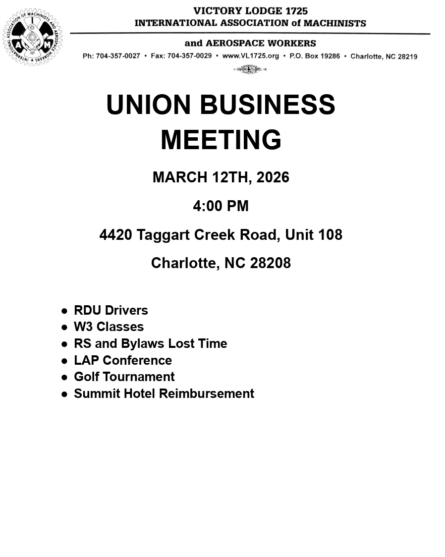 Local Lodge 1725 has been part of the Charlotte community since it was first chartered on June 2nd, 1943 after workers at Brown Equipment and Manufacturing voted to be represented by the Union. Representation in the airline industry started with Eastern Airlines in the early 1950’s.